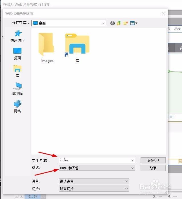 8、储存时一定需要注意,要选择“html和图像”。它弹出的警告不需要理会,直接点确定就可以。一般来说,主页是index。