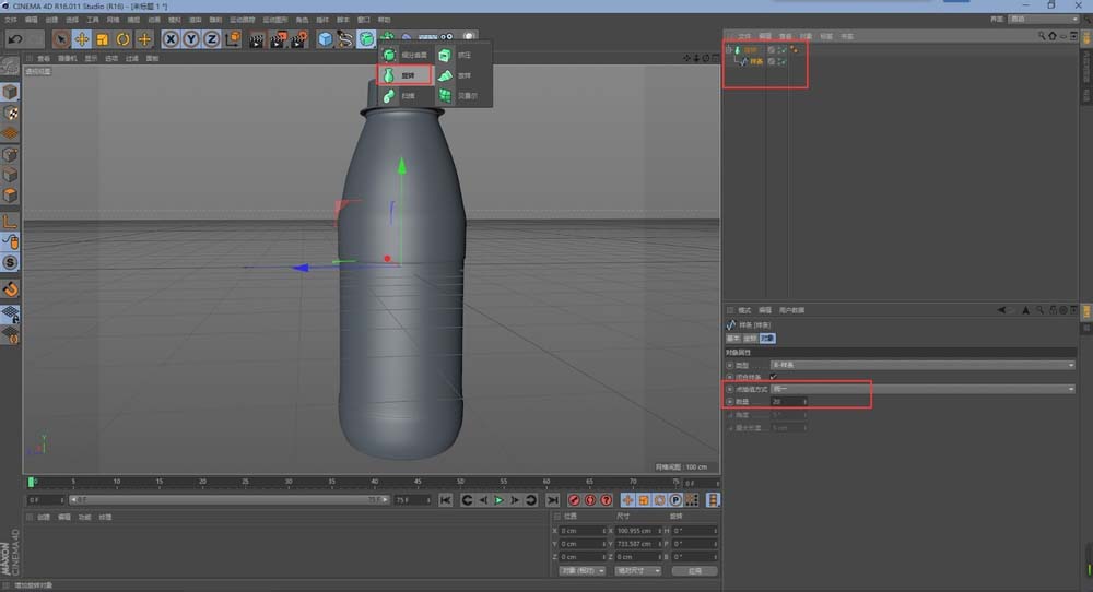 10、然后,为其样条线添加旋转,适当的添加细分以增加圆滑度。(你可能发现了,瓶盖以及瓶子的螺旋丝没做,这里是因为看不见它所以就没做,你可以利用螺旋线和圆进行扫描来做,也可以将其转换成可编辑对象进行操作)