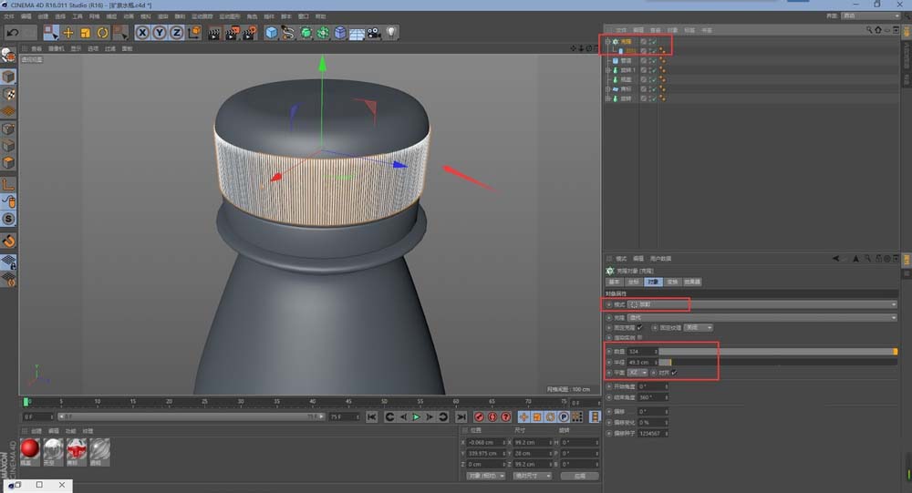 12、还有瓶盖上的条纹,可以利用转换为可编辑对象对其隔点调点来实现,我这里不对其转可编辑对象出来,而是用一个圆柱基础对象,然后对其做克隆处理,使用放射克隆,数量等参数可以看截图。对其的话可以调整到顶视图进行对其。