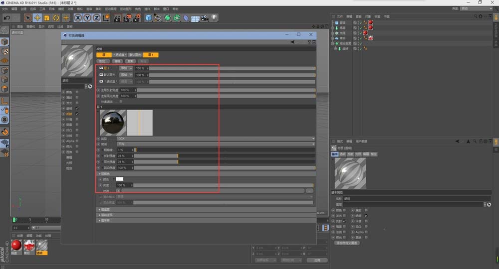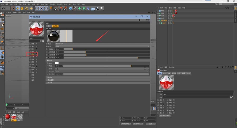 13、模型已经创建完毕,有需要添加的细节可以自己再添加。下面就是来调整材质,由于不是讲材质,我只是将一些截图呈现给大家,可以作为一个参考。瓶盖的材质参数调整如下图(我用的是C4D r16版本,如果你用的其他版本反射上不一样也是正常的)。