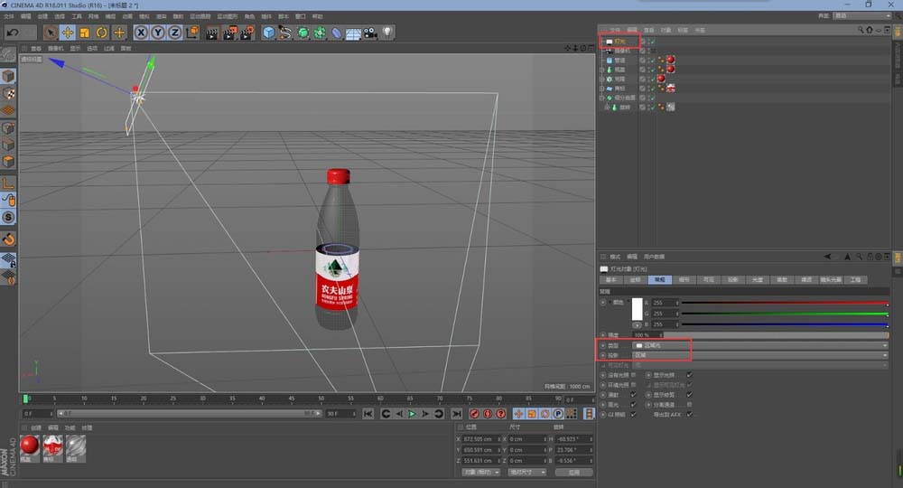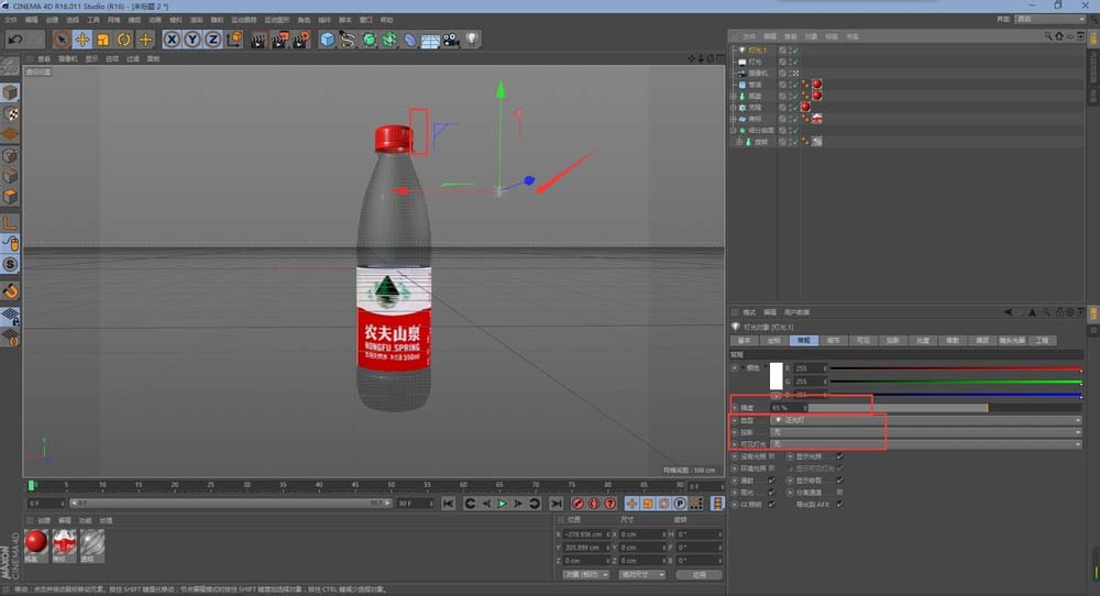 17、然后,利用一个区域光放在物体的左上角的位置作为一个主光,并打开区域投影,这样瓶盖右边的位置比较暗,所以我们在用一个点光源作为一个辅光,强度要弱些。
