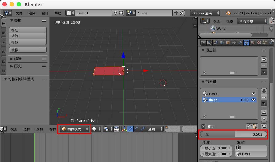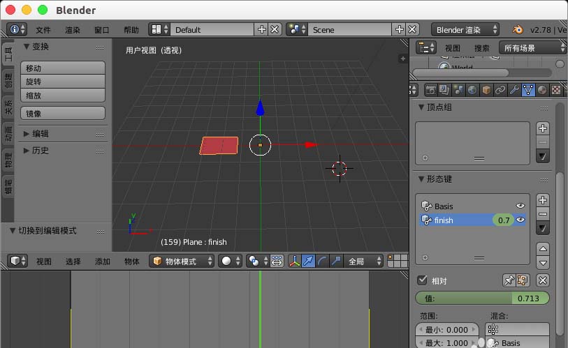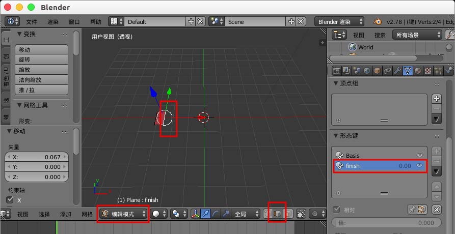 4、选择“finish”形态键,进入“编辑模式”,选择平面一边把它移动缩小。