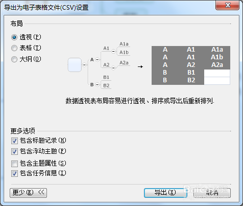 3)“大纲”:以大纲的形式展示出所有的信息。如果您要导出所有主题的任务信息,大纲布局是最好的。