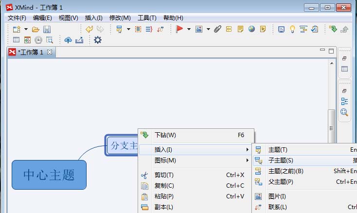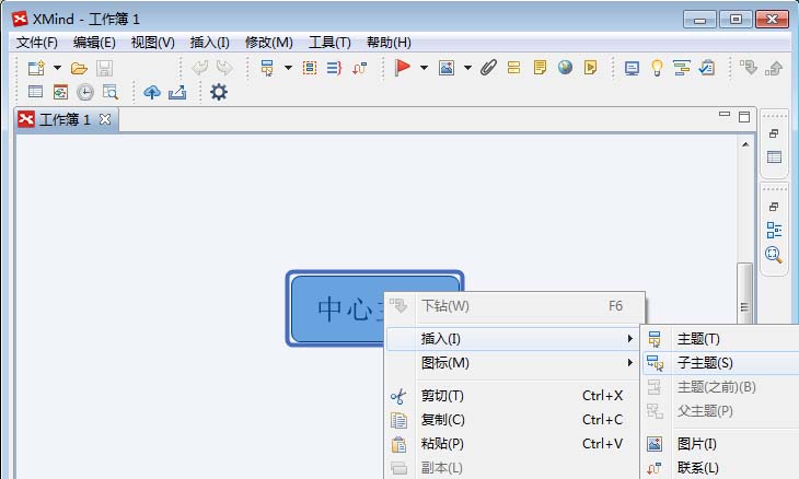 2、将光标移到“中心主题”上,点击右键,选择“插入”“子主题”,就可以在“中心主题”上添加一个二级“子主题”。同样的效果也可以通过敲击“回车”键实现。