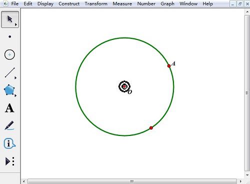 步骤一打开几何画板,选择左侧工具栏的“圆工具”,在画板空白区域画圆O并在圆上任取一点A,双击圆O作为旋转中心;