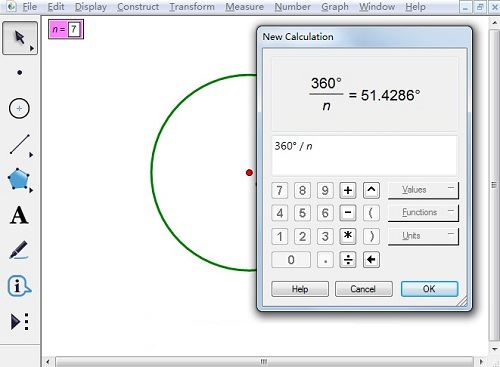 步骤二执行“数据”——“新建参数”命令,在弹出的对话框新建参数n=7,并执行“数据”——“计算”命令,在弹出的对话框计算360°/n(注意这时要带单位“度”);
