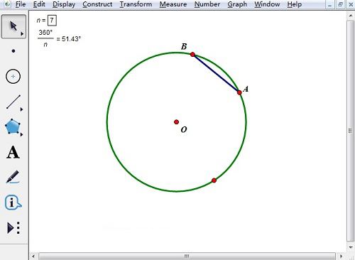 步骤三选择点A,单击菜单“变换”——“旋转”,出现旋转对话框,单击计算结果‘360°/n’,作为标记角度,得到B点;使用线段工具连接线段AB;