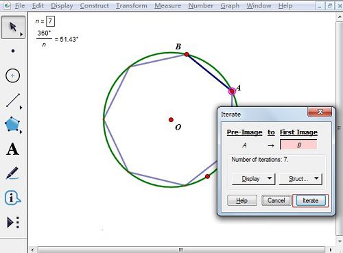步骤四依次选择点A和参数n,按住“Shift”键不放,单击“变换”——“深度迭代”,出现迭代对话框,单击点B作为初象,这时屏幕上显示出完整的正七边形,按“迭代”按钮完成操作。