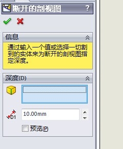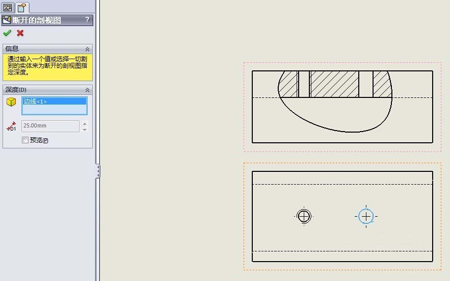 8、当然如果不知道参数的话,可以在深度参考选项中选择俯视图中孔的轮廓线,也可以进行剖视,然后刷新一下,就完成剖视。