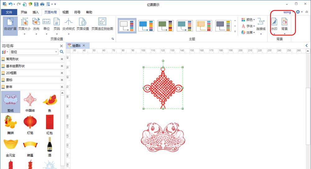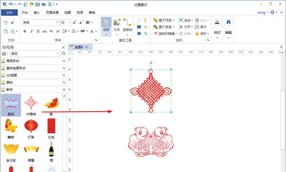 2、在界面左侧的符号库中有很多与新年相关的剪切画可以直接拖到画布上使用,这些剪切画可以随意调整他们的大小,位置和旋转。
