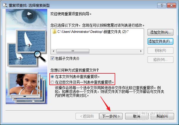 5、接下来我们需要选择acdsee以何种方式查找重复文件,默认是在选择的文件夹内查找,下面的是将选中的文件夹中的文件和其它文件夹做对比,选择其中一种然后点击下一步。