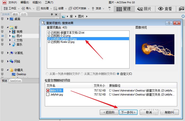 7、很快acdsee去重就查找完成了,我们在上面选择重复项合集,然后在下方选择要删除的重复文件,最后点击下一步。