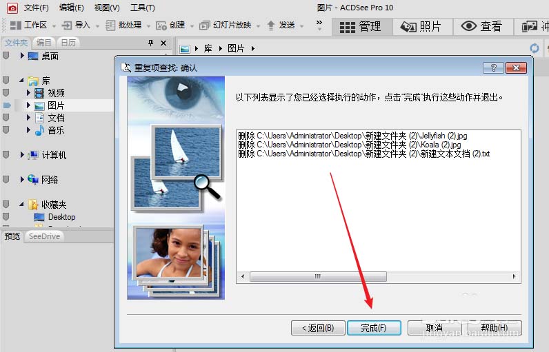 8、最后acdsee会提醒我们选择了要删除哪些文件,建议大家仔细看看,不要误删除重要的文件,没问题就点击完成。acdsee怎么去重已经教给大家了,赶紧将不必要的重复文件删除吧。