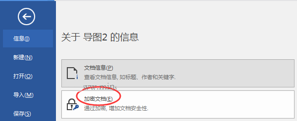 2、单击“文件”>“信息”>“加密文档”,以打开密码设置窗口;