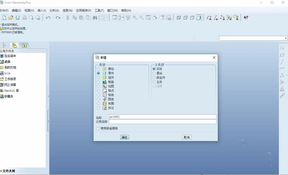 1、运行proe5.0软件,点击新建图标,选择类型为零件,子类型为实体,名称默认即可,取消使用缺省模板的打勾,选择mmns_part_solid选项,即毫米单位。