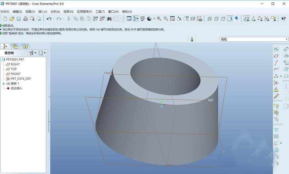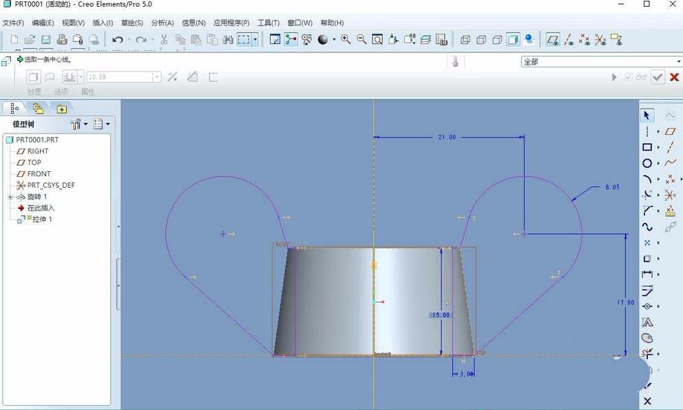2、在过去的proe教程经验中,对常用的特征已经充分说明,接下来就是相对简化。创建一个旋转特征,绘制草图,如下图所示。