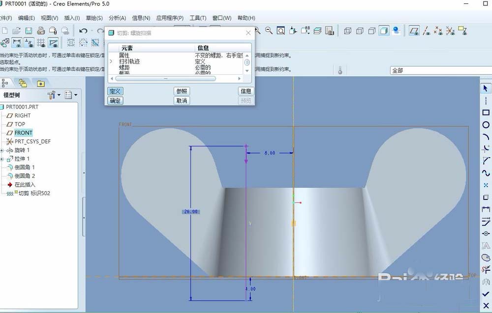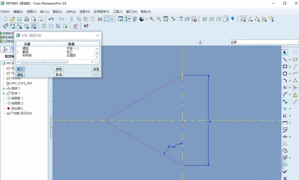 5、创建螺旋扫描--切口,使用右手定则(一般情况下均为右手),绘制草图,完成后退出草图,输入节距,如图。