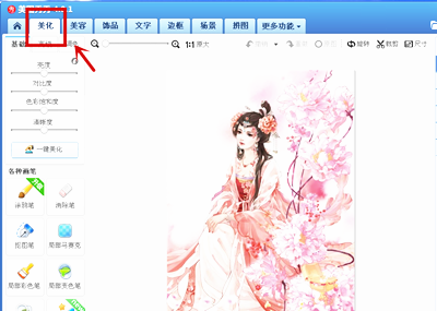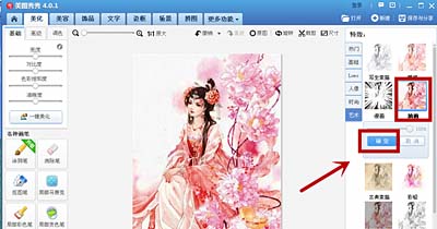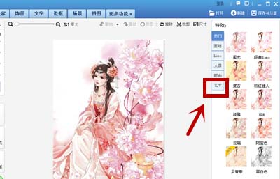 4、在美图秀秀操作页面上,出现图片后。用鼠标点击“美化”,再点右边特效中的“艺术”。