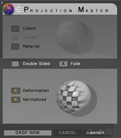 3、点击“Projection Master”按钮,弹出投影大师设置面板,取消默认开启颜色的选项,勾选“Deformation变形”按钮。当绘制模型的表皮细节时,可以激活“Normalized”选项和“Fade”选项,最后点击“DROP NOW”按钮,将模型脱落。此时的模型已经被脱落到画布上了,下面对模型进行细节的绘制。