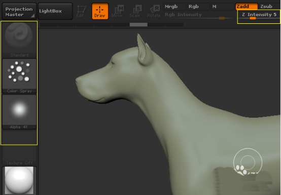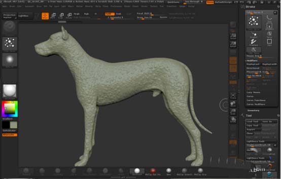1、绘制前提示:进入投影大师模式之钱务必大细分调至到最高级别。在工具控制面板中,单击“Load Tool”按钮载入工具。您可以使用自己制作完成的模型,也可以使用ZBrush默认提供的模型,在画布中按住鼠标左键并拖动拉出模型,按“T”进入编辑模式。按Shift键让模型的侧面完成处于正角状态,按F键最大化居中显示物体。