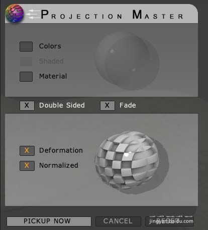 6、绘制完毕以后,按键盘上的“G”键,弹出投影大师的设置面板,勾选“Double Sided双面”选项,这样您绘制的置换效果就可以同时应用于物体两面了。点击“Pickup Now”按钮。旋转模型,你会发现,模型的两面都被绘制上了置换细节。