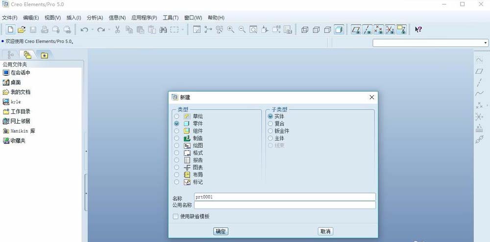 1、双击打开proe5.0软件,点击新建图标,选择类型为零件、子类型为实体,取消使用缺省模板的打勾,再选择mmns_part_solid,即毫米单位。