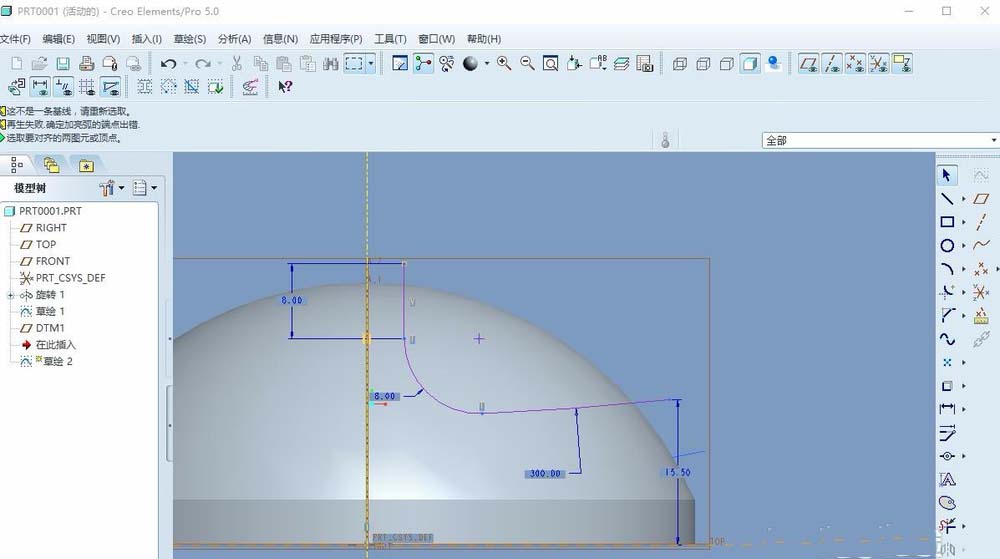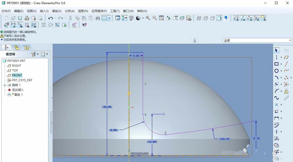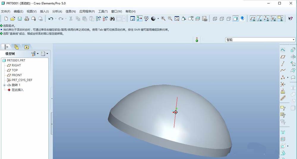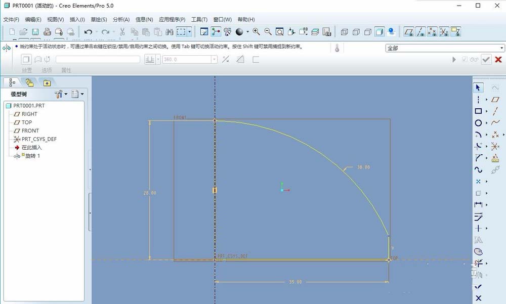 2、点击旋转特征图标,以front平面为草图平面,利用直线、中心线、圆弧绘制图形,完成后退出草图,定义旋转类型与角度回车或者中间确定。