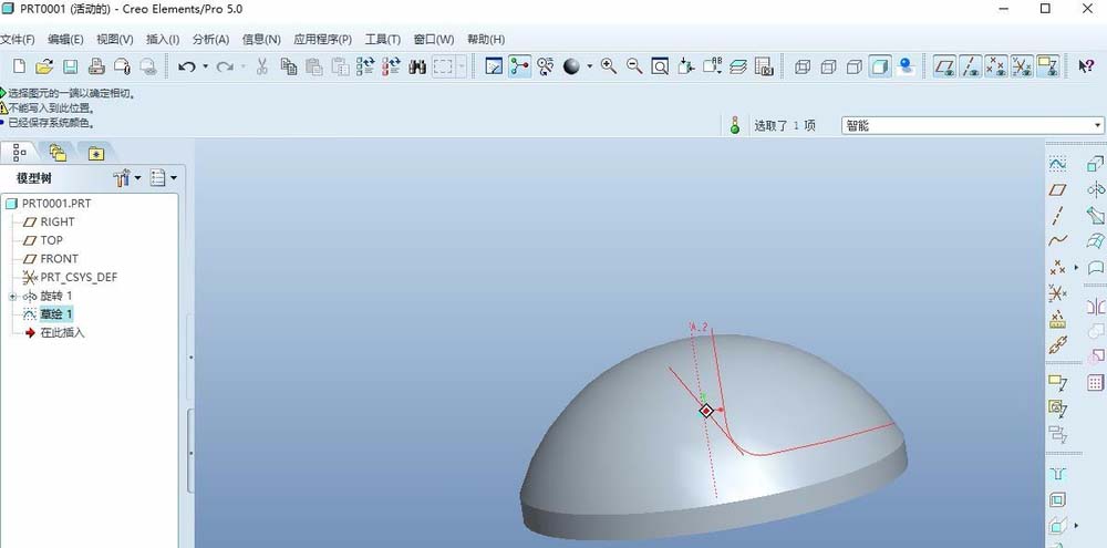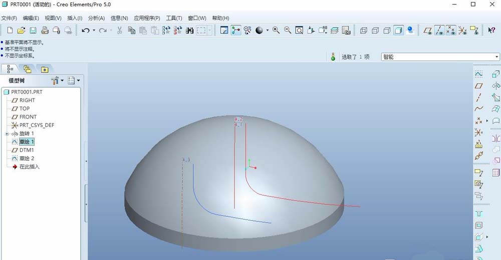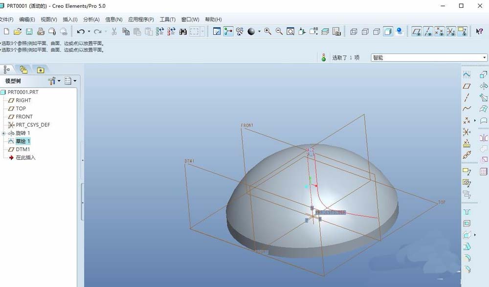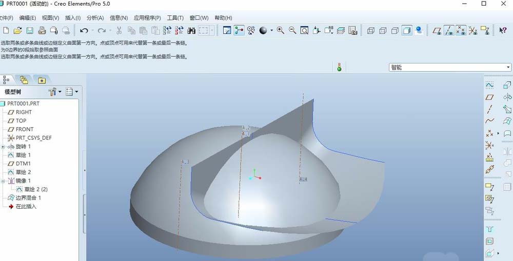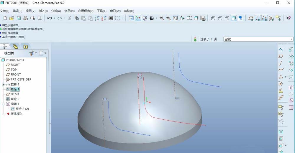 5、镜像,将上述一步所绘制的曲线作为镜像特征,定义front平面为镜像平面,效果如下图所示。