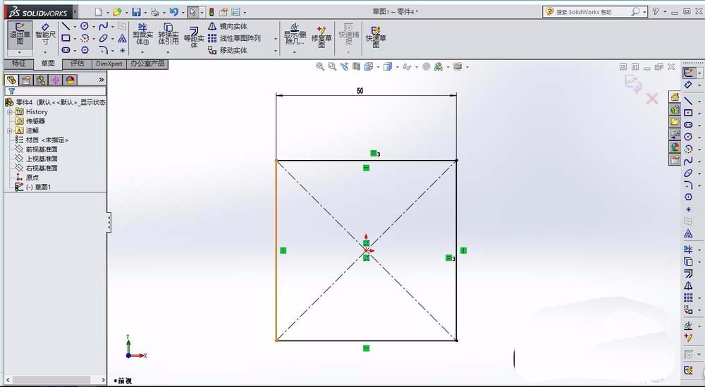 1、打开solidworks2014软件,新建一个零件模型文件,点击拉伸命令,选择前视图,绘制草图,利用中心矩形以及相等约束矩形,然后拉伸矩形,为两侧对称。如图。
