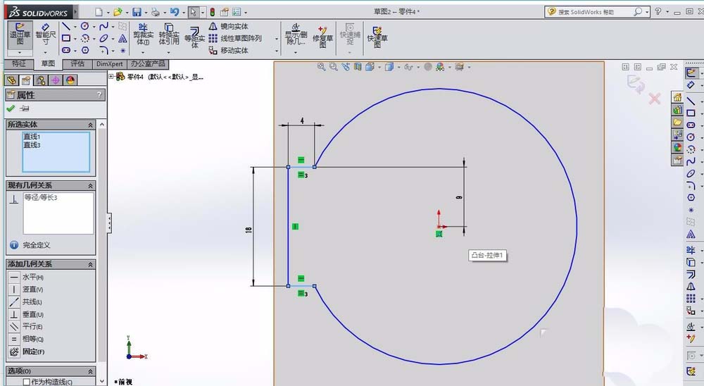 2、在前视图基准面,绘制图形,绘制完毕后,拉伸切除,两侧对称,如下图所示。在上视图绘制一个圆形,拉伸凸台。