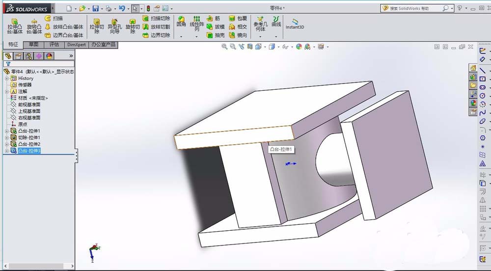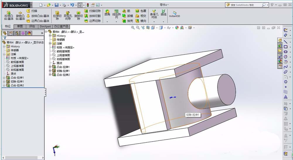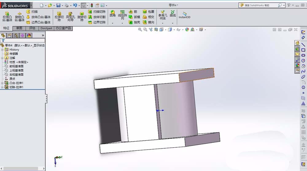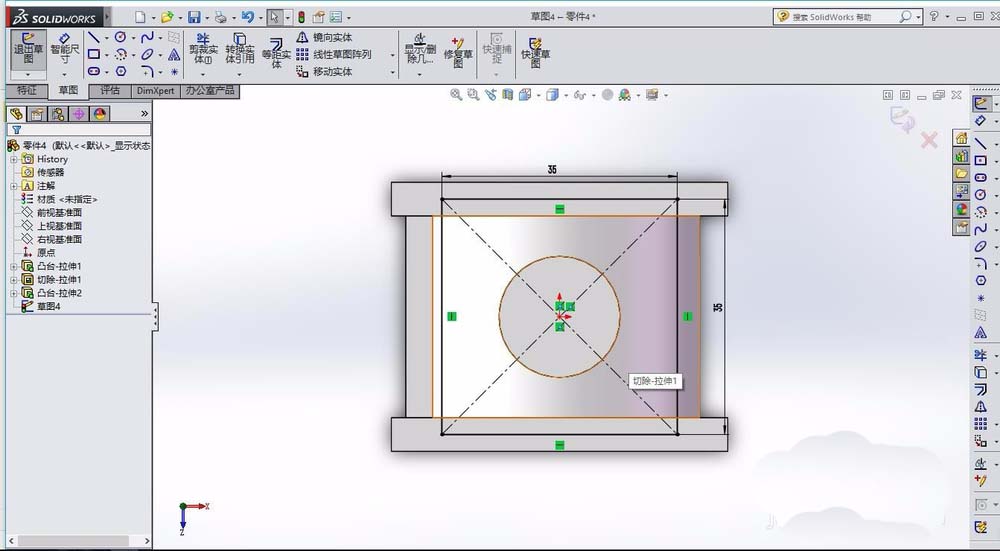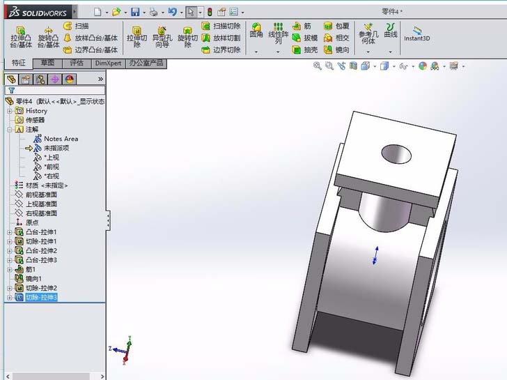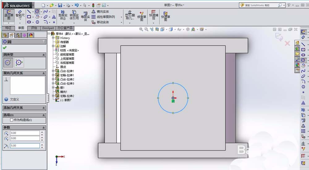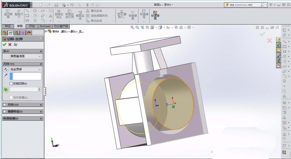 5、在特征拉伸1的上表面,绘制圆形,拉伸类型为切除,选择完全贯穿。在特征拉伸3的上表面,绘制圆形,同样为拉伸切除。