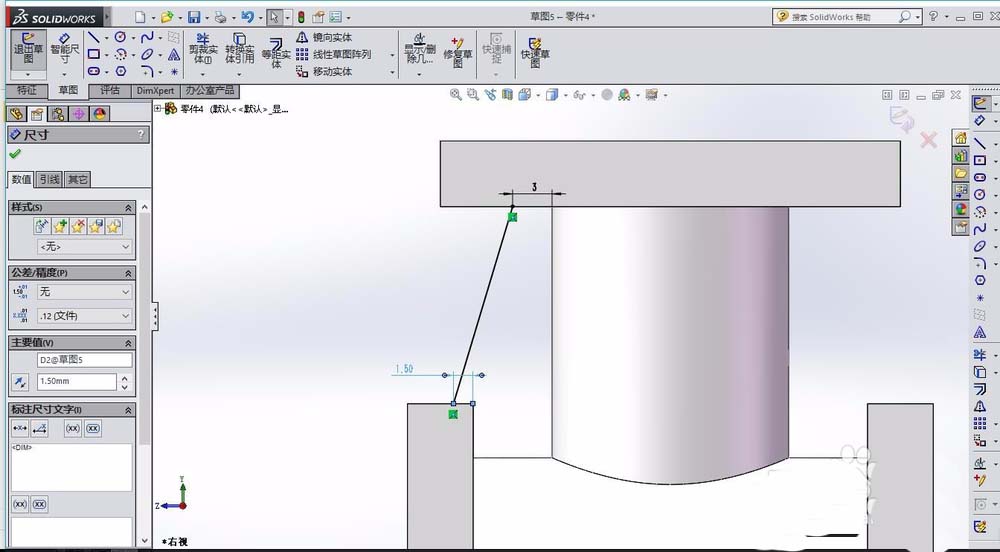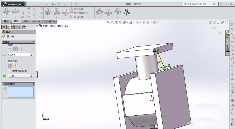 4、在右视图基准面绘制草图,绘制一条直线,设置相关的距离参数,完成后选择特征筋,然后进行镜像,镜像该筋。
