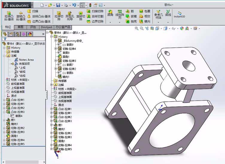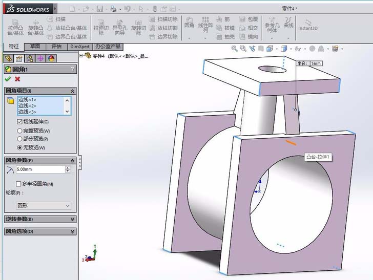 6、倒圆角,圆角的大小为5,在特征拉伸1的上表面绘制4个圆,拉伸切除,成为4个通孔。在如下图所示的位置继续拉伸切除通孔。