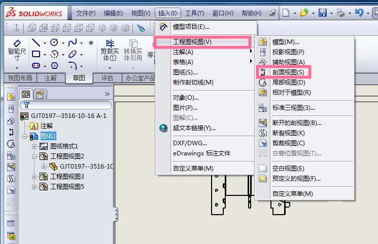 2、点击“插入”,找到“工程图视图”,找到“剖面视图”;