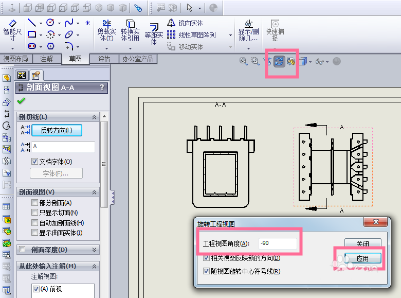 7、可以将剖面视图改变方向,点击上面的旋转,输入角度-90,点击应用。剖视图方向改变。