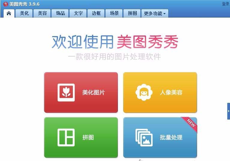 1、打开美图秀秀这款软件,进入美图秀秀的操作界面,如图所示: