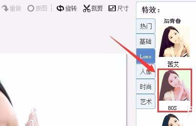 6、点击LOMO选项,在其内找到80s选项,如图所示: