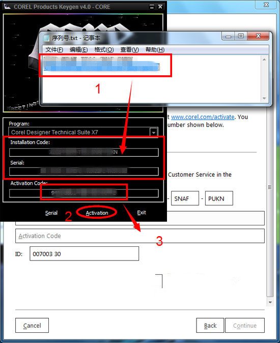 8、将注册信息复制到注册机中,点击Activation,然后将生成的激活码复制到注册界面,点击Continue即可完成破解
