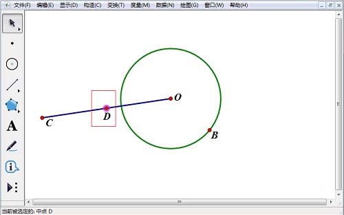2、构造中点。选中线段OC,选择“构造”—“中点”命令,制作出线段OC的中点D。