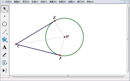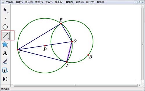 4、构造三角形。两圆交点为E、F,使用“线段工具”连接线段CF、线段CE、线段OF、线段OE。