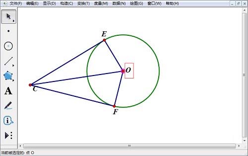 1、构造圆和线段。利用圆工具制作一个圆O。选择“点工具”,在圆外适当的位置绘制点C。然后选择“线段工具”,绘制出线段OC。