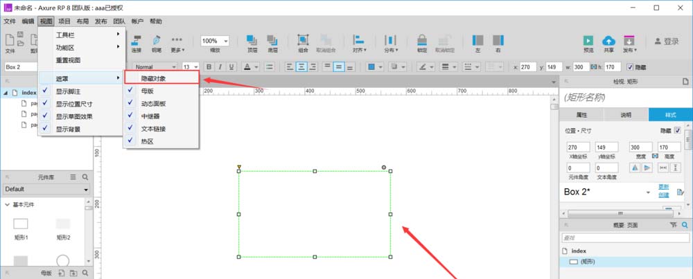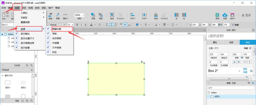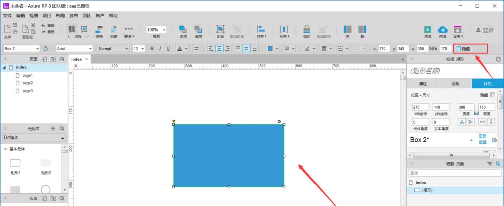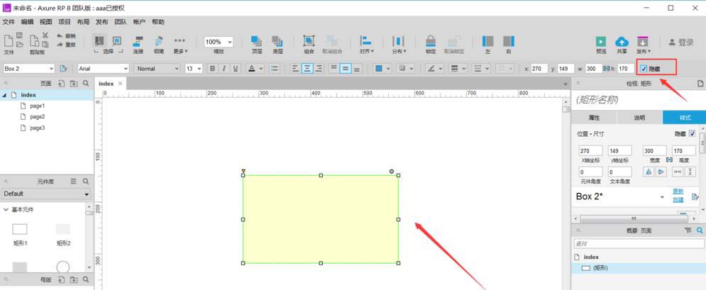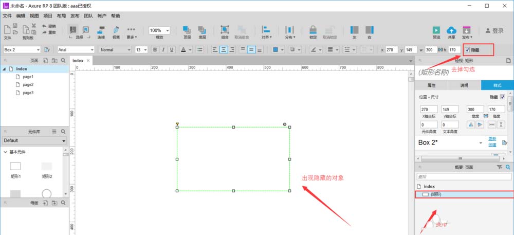 6、顺便教大家如何将隐藏的元件再显示出来,在下图中右侧的概要:页面中点击我们隐藏掉的元件,在画布中将出现隐藏的元件,然后去掉右上角“隐藏”的勾选。