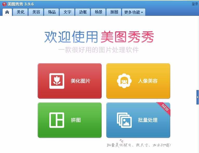 1、打开美图秀秀这款软件,进入美图秀秀的操作界面,如图所示: