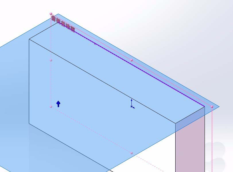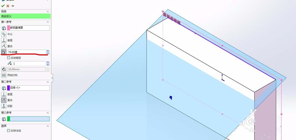 2、单机前视基准面,点击工具栏(或者键盘S键,如果没有基准面按钮右键S弹出的工具栏自定义草图选项拖动添加)基准面,选择如图角度70,系统会自动生成如图所示以参考线为旋转中心线,同时与前视基准面保持70度的基准面