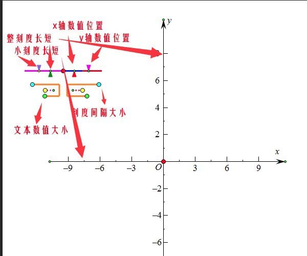 5、刻度如何更改呢?看到轴上的小绿点吗,呵呵,还是这些绿点,每一个设置都有它专门的作用哦,将x轴的绿点向外拉拉,看到吗?刻度的位置变换哦。