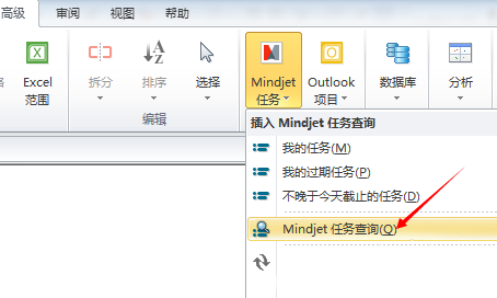 2、在功能区的任务选项卡或高级选项卡上,点击Mindjet任务,在下拉菜单中点击预先定义的查询或点击Mindjet任务查询;