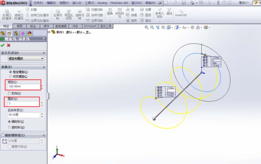 2、点击特征下的曲线 — 螺旋线/涡状线命令,点击后选择两圆形草图任意一个即可(示例选择内圆),填入螺距和圈数点击确定。