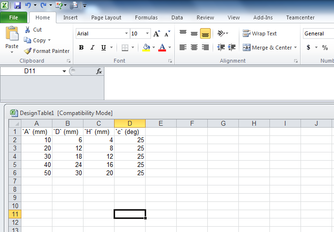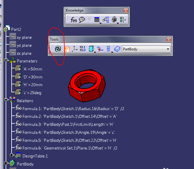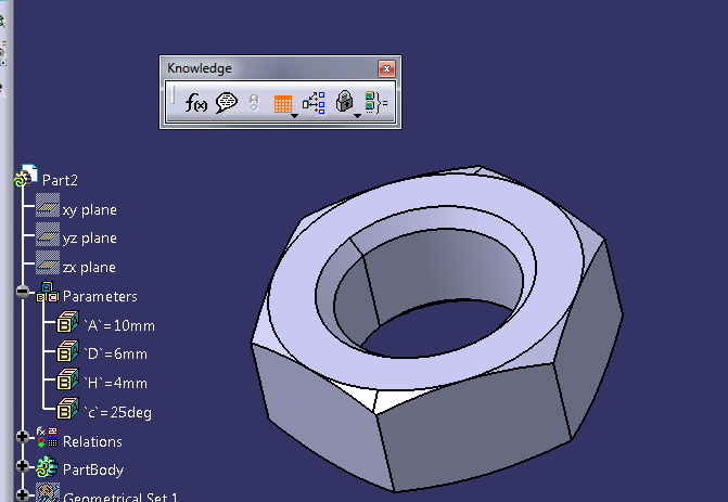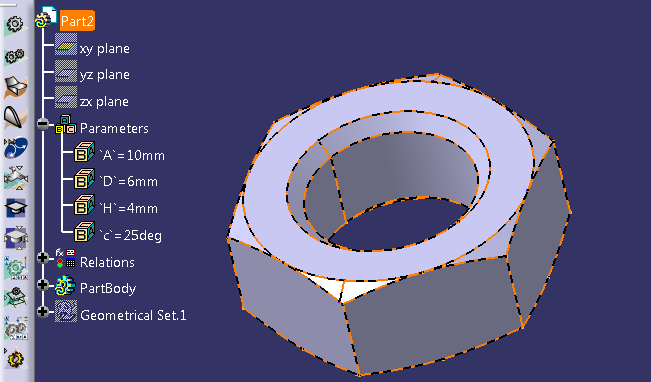 1、建立一个带有参数化设计的模型,例如螺母,将它的大小高度角度分别用参数A,D,H,c控制,如图。