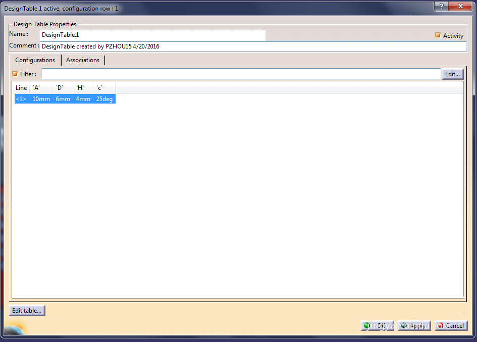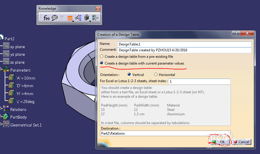 6、确认后你在catia中可以看见一个设计表对话框,里面有你刚刚选的参数,这个时候可以点编辑表对你的设计表进行编辑。