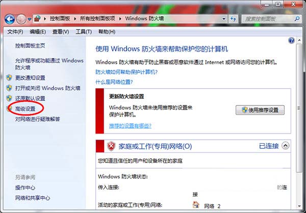 1、打开控制面板\所有控制面板项\Windows 防火墙,选择高级设置